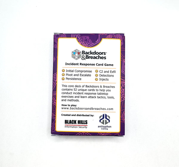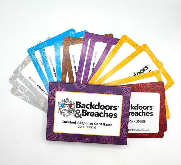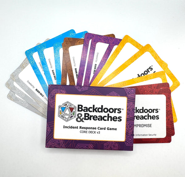 Backdoors & Breaches: Core Deck v3 is an incident response card game created by Black Hills Information Security and Antisyphon Training to help information security professionals learn cybersecurity and conduct fun and engaging table top exercises.